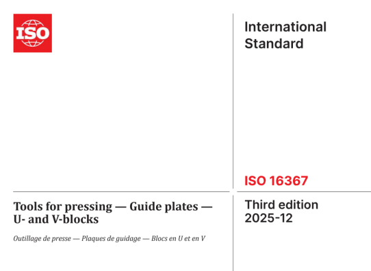 ISO 16367:2025 pdf download,Tools for pressing — Guide plates — U- and V-blocks. ISO 16367:2025 defines the key dimensions and tolerances for guide plates, U-blocks, and V-blocks employed in press tools.Additionally, it specifies the identification and designation system for U-blocks and V-blocks.